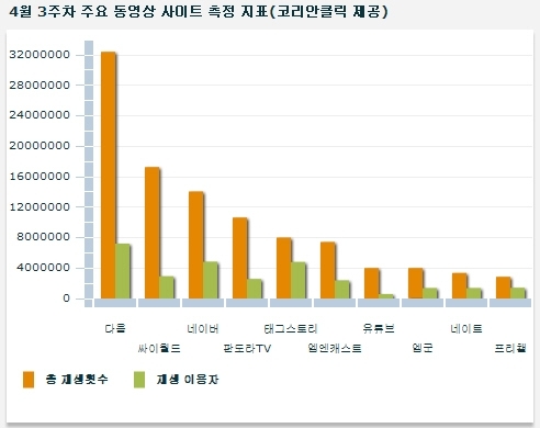 코리안클릭이 조사한 동영상 총 재생횟수(TS, 토탈 스트림) 통계에 따르면 4월 3주차 다음 TV팟의 동영상 총 재생횟수는 3천 2백만여회로 싸이월드(1천 7백만)와 네이버(1천 4만), 판도라TV(1천만)를 제치고 1위를 차지한 것으로 나타났다.