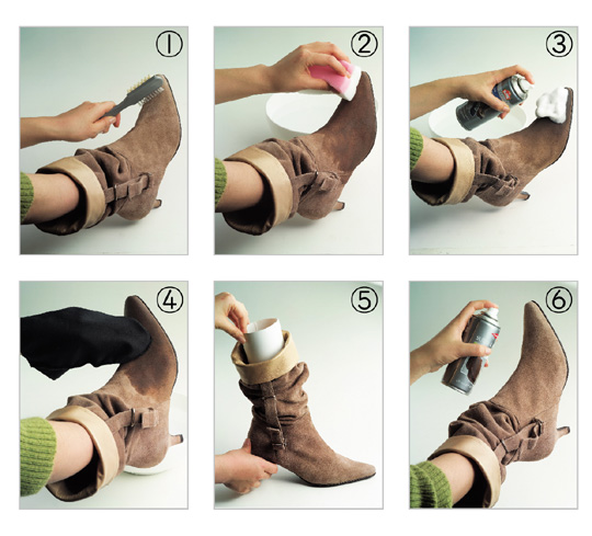 스웨이드는 가죽 뒷면의 털(기모)을 세운 것입니다. 스웨이드 부츠는 우선 털 사이 먼지를 제거한 뒤 전용 스프레이를 뿌리고 다시 솔로 가볍게 쓸어주면 됩니다. 일반 슈크림이나 구두약을 사용하면 스웨이드가 거칠어집니다. 꼭 전용 제품을 써주세요.