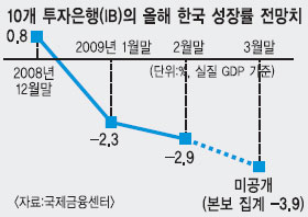 지난 2월 말 국제금융센터가 발표한 올해 한국 경제성장률에 대한 IB 전망치는 평균 -2.9%였다. 지난 2월 윤증현 기획재정부 장관 취임 직후 내놓은 전망치 -2%와 최근 한은의 수정 전망치인 -2.4%에 근접한 수치다.