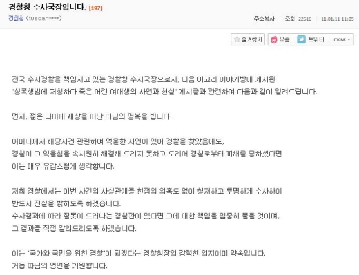 한편 인터넷에서 이 글이 논란이 되자 11일 오전 11시5분 전국 수사 경찰을 책임지고 있다는 경찰청 수사국장이 직접 글쓴이가 주장한 편파수사 여부가 있었는지에 대한 사실관계를 철저히 조사하겠다고 답하는 댓글을 올렸다.