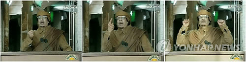 갈색 두루마기 전통 의상에 터번을 쓰고 연단에 선 카다피는 비장한 모습으로 원고 없이 연설을 시작했다.