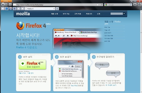 ◆사진설명 : 파이어폭스 4.0 베타버전 다운로드 사이트 화면.