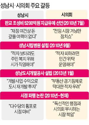 성남시는 민주당 소속인 이 시장과 달리 시의회 다수당은 새누리당이 차지하고 있다. 시장의 판교신도시 조성 공사비 5200억원에 대한 채무 지급유예(모라토리엄) 선언부터 성남시립의료원·도시개발공사 설립 논란, 시 산하 재단 대표의 임명 부결까지 시와 시의회는 매번 부딪쳤다. 지난해에는 법정 시한(12월31일)까지 새누리당의 반대로 새해 예산안을 처리하지 못해 1주일 넘게 사상 초유의 준(準)예산 체제를 맞기도 했다.