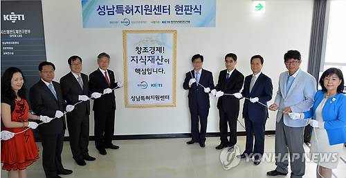 (성남=연합뉴스) 경기도 성남시는 4일 판교테크노밸리 내 판교글로벌R & D센터에 '성남특허지원센터'를 설치하고 개소식을 했다. 특허지원센터는 성남산업진흥재단과 전자부품연구원이 공동 운영한다. 개소식에 참석한 이재명 성남시장(왼쪽에서 네번째), 김경원 전자부품연구원장(왼쪽에서 다섯번째) 등이 현판식을 하고 있다. < < 성남시 제공 > > 2013.6.4