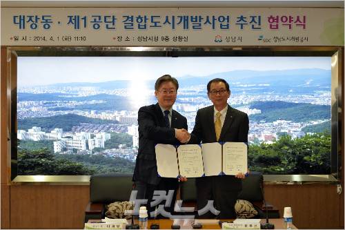 성남시(시장 이재명)는 대장동·제1공단 결합 도시개발의 효율적인 사업 추진을 위해 1일 오전 11시 시청 9층 상황실에서 성남도시개발공사(사장 황무성)와 업무대행 위·수탁 협약을 체결했다.