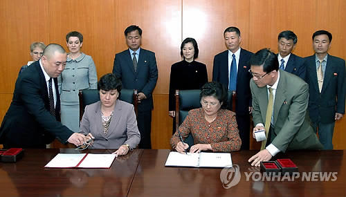 (평양 조선중앙통신=연합뉴스) 북한 국제무역촉진위원회와 러시아 사할린 주정부 사이에 무역경제협조에 관한 공동실무그룹 제7차 회의 의정서가 24일 평양에서 조인됐다고 조선중앙통신이 보도했다. 2014.4.24