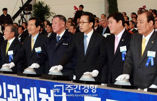 | 2010년 4월 당시 최경환 지식경제부 장관이 이명박 대통령, 정몽구 현대차그룹 회장, 정세균 민주당 대표, 조석래 전경련 회장(오른쪽부터)과 함께 충남 당진 현대제철 공장에서 준공 버튼을 누르고 있다. | 박민규 기자 |