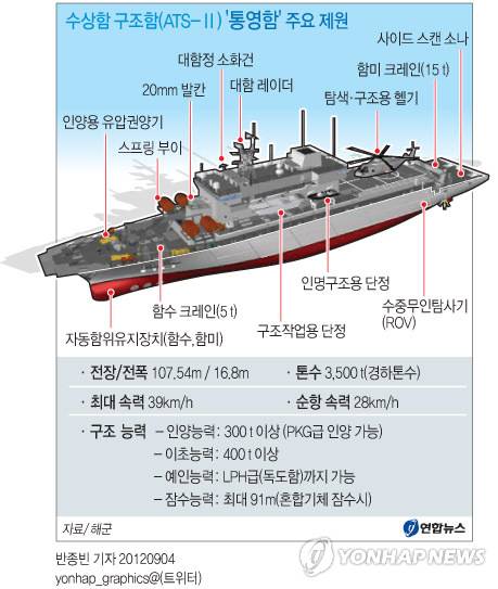 해군과 통영함 제작사인 대우해양조선은 이날 방위사업비리 태풍의 핵심에 놓여 있는 통영함의 성능과 수중 선체 구조 시범을 보였다. 좌초된 함정을 끌어내는 이초를 비롯해 인양, 예인, 잠수지원 등 수상구조함의 주요한 작업은 정상적으로 진행됐다.