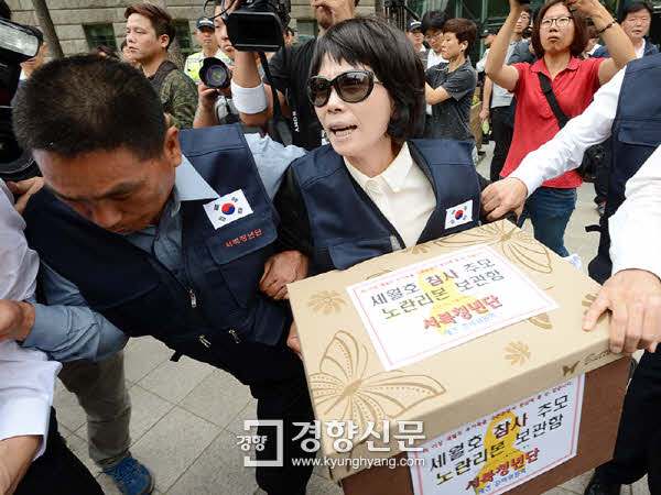| 서북청년단 재건 준비위원회 회원들이 지난 9월 28일 서울시청 앞 서울광장에서 세월호 실종자 구조활동 중단 및 세월호 인양을 촉구하면서 광장 인근의 노란 리본을 떼려다 제지하는 경찰에 밀려나고 있다. | 김정근 기자 jeongk@kyunghyang.com |
