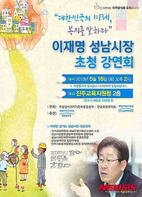 【진주=뉴시스】김동수 기자 = 새정치민주연합 진주시 을지역위원회(위원장 서소연)는 이재명 성남시장이 오는 16일 오후 2시 진주교육지원청에서 '대한민국의 미래, 복지를 말하다'라는 주제로 강연회를 한다고 13일 밝혔다.
