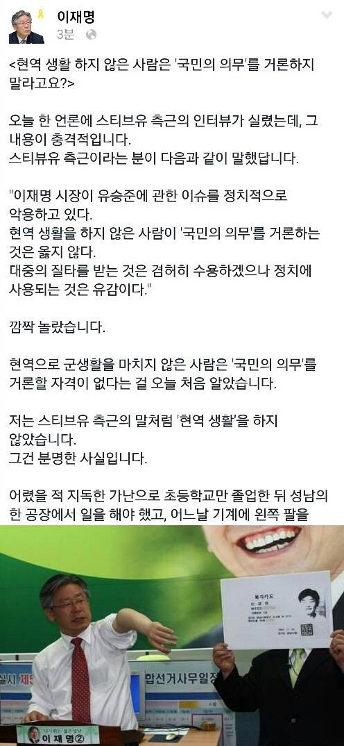 이 시장은 이날 자신의 페이스북을 통해 "현역생활하지않은 사람은 국민의 의무를 거론하지말라고요?"라는 제목으로 글을 올렸다.
