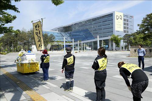 (성남=연합뉴스) 이우성 기자 = 선체 인양을 촉구하며 지난 2월 진도 팽목항을 출발해 서울 광화문까지 걷고 있는 '세월호 삼보일배 순례단'이 31일 경기 성남시청 광장에 도착했다.