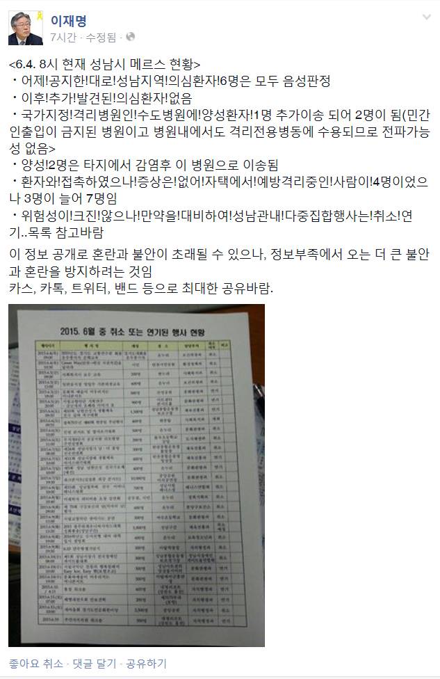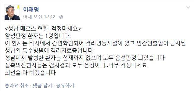 앞서 이 시장은 메르소 공포가 확산돼자 지난 3일 자신의 페이스북에 “성남 메르스 현황..걱정마세요”라는 글을 올리고 성남 메르스 환자 현황을 상세히 설명했다.