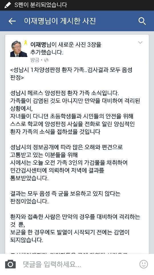 이재명 성남시장은 7일 자신의 sns를 통해 ‘성남시 1차양성판정 환자 가족..검사결과 모두 음성 판정’이라는 글을 올렸다.