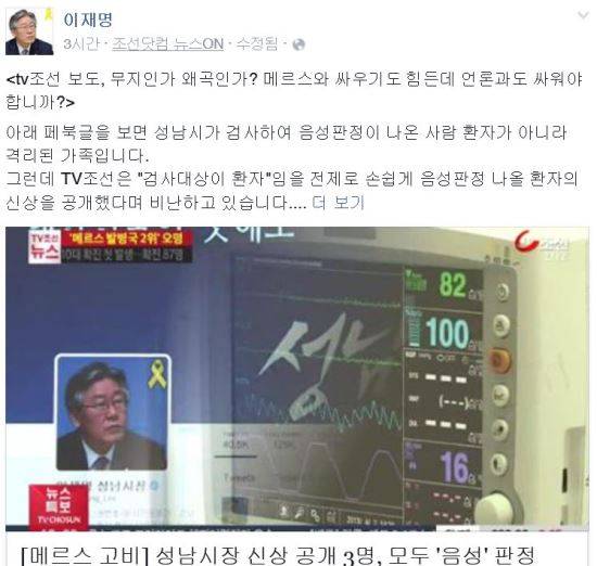 이재명 성남시장은 8일 자신의 페이스북에 ‘tv조선 보도, 무지인가 왜곡인가? 메르스와 싸우기도 힘든데 언론과도 싸워야 합니까?’라는 글을 올렸다.