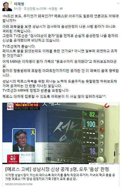 이재명 성남시장은 8일 자신의 페이스북에 'TV조선 보도, 무지인가 왜곡인가? 메르스와 싸우기도 힘든데 언론과도 싸워야 합니까?'라는 제목의 글을 게재했다.