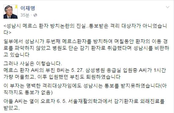 이에 대해 이재명 시장은 자신의 트위터, 페이스북을 통해 "사실은 이렇다"고 운을 뗀 뒤 "메르스 환자 A씨의 부친 B씨는 지난달 27일 삼성병원 응급실 입원중 A씨가 1시간 가량 머물렀고, 이후 입원했던 부친도 퇴원했다. 이 부자는 명백한 격리대상자임에도 성남시는 통보를 받지 못했다"고 해명했다.