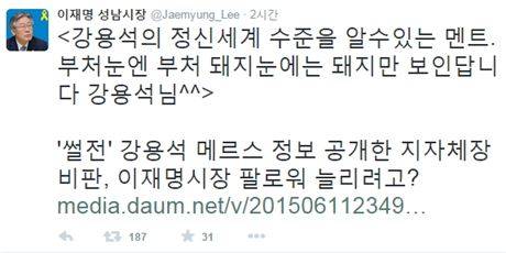 이재명 성남시장은 12일 자신의 트위터(@jaemyung_lee)를 통해 "강용석의 정신세계 수준을 알 수 있는 멘트. 부처 눈엔 부처 돼지 눈에는 돼지만 보인답니다"라고 적었다.