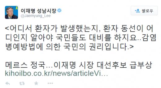 이재명 성남시장이 15일 메르스 관련 신속한 정보 공개를 하고 있는 것과 관련해 "어디서 환자가 발생했는지, 환자 동선이 어디인지 알아야 국민들도 대비를 한다"고 밝혔다. 이 시장은 "감염병예방법에 의한 국민의 권리"라고 덧붙였다.