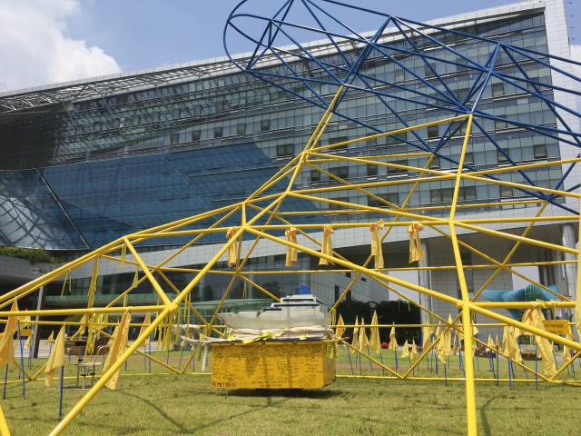 [한겨레] 세월호 참사로 숨진 경기도 안산 단원고 학생 등을 추모하고 진실규명을 요구하고 있는 '삼보일배 순례단'의 세월호 모형 배와 수레가 성남시청 잔디광장에 전시됐다. 성남시는 단원고 2학년 8반 고 이승현군의 아버지 이호진(57)씨가 국민들과 함께 지난 2월23일부터 지난 13일까지 111일 동안 전남 진도 팽목항에서 서울 광화문까지 대장정을 하며 끈 세월호 모형 배가 실린 수레를 맡아 전시하기로 했다고 15일 밝혔다. 모형 배는 '반면교사'라고 쓰인 돛을 달고 전국을 누볐다. 성남시가 시청 광장에 세운 세월호 추모 조형물(길이 20m, 폭 15m, 높이 9m) 안에 전시됐다.