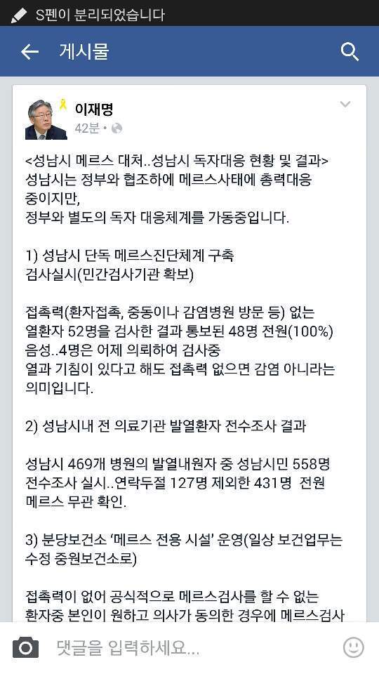 이재명 성남시장은 16일 “성남시 메르스 대처..성남시 독자대응 현황 및 결과”를 발표하면서 “성남시는 정부와 협조하에 메르스사태에 총력대응 중이지만, 정부와 별도의 독자 대응체계를 가동중”이라고 밝혔다.