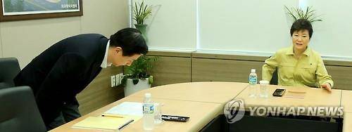 이에 송 원장은 "메르스 사태 때문에 대통령님과 국민 여러분께 심려를 끼쳐 드렸다. 너무 죄송하다"며 자리에서 일어나 허리를 거의 90도로 굽혀 박 대통령에게 인사했다.