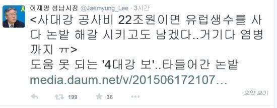 이 시장은 “사대강 공사비 22조원이면 유럽생수를 사다 논밭 해갈 시키고도 남겠다”라며 “거기다 염병까지”라며 ‘도움 못 되는 '4대강 보'..타들어간 논밭’이라는 기사를 링크했다.