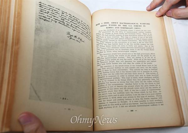 | ▲ 한국전쟁 당시 미군이 한반도에서 세균전을 벌였다는 조사 결과를 담은 '한국과 중국에서의 세균전에 관한 국제과학위원회의 사실조사 보고서'(일명 니덤보고서, 임종태 감독 공개)에 실린 플로이드 오닐(Floyd B. O'Neal) 중위의 진술서. |