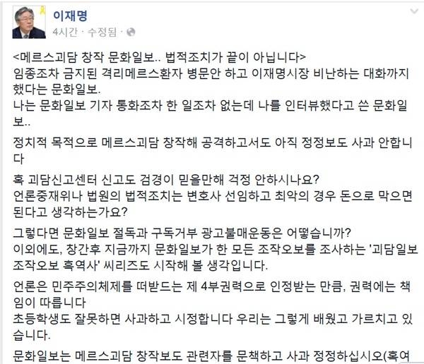 18일 오전, 이 시장은 페이스북에 문화일보가 "정치적 목적으로 메르스 괴담을 창작해 공격하고서도 아직 정정보도 사과를 하지 않는다"며 "민주주의를 좀 먹는 악습인 이번 허위보도는 수년이 걸리더라도, 다른 일을 못하게 되는 한이 있더라도 반드시 끝까지 책임을 묻겠다"는 내용의 글을 올렸다.