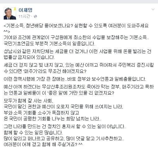 이재명 성남시장은 20일 자신의 페이스북을 통해 “기본소득, 청년배당 들어보셨나요?”라며 “실현할 수 있도록 여러분이 도와주세요”라고 적었다.