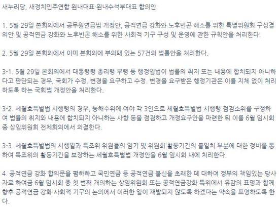 지난 5월29일 여야는 행정입법에 대해 국회가 수정·변경을 요구할 수 있는 국회법 개정안을 처리한 뒤 6월 임시회에서 세월호특별법 시행령 점검소위를 구성해 법률의 취지와 내용에 합치되지 않는 사항을 점검한 뒤 개정요구안을 마련키로 했다. 당시 여야 합의사항은 3-1은 국회법 개정 3-2는 세월호시행령 문제점 해결 3-3은 세월호특조위 활동기간 불일이 문제 해결 등을 담았다. 당시 합의사항은 공무원연금법 처리 관련 내용이 1번항에, 본회의 부의 법률 처리가 2번항에, 공적연금 강화 합의문에 대한 정부측 폄훼에 대한 사과 요구가 4번항에 담겼다. 3번항이 3-1, 3-2, 3-3 등으로 묶여 있는 것은 사실상 이 모든 것은 국회법 개정의 가장 1차적인 목표가 세월호특별법 시정을 위함임을 보여준다.
