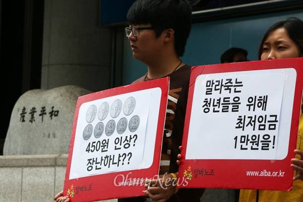 | ▲ "최저임금 450원 인상? 장난햐냐?" 알바노조 회원들이 9일 오전 서울 마포구 경총회관앞에서 '최저임금 6,030원 규탄 및 최저임금 1만원 촉구 기자회견'을 열었다. 참석자들은 "국민들의 삶이 100원짜리 몇개의 흥정거리가 되었다" "올해도 공익으로 포장된 정부 입장이 그대로 결정되었다"며 최저임금위 구조 개혁을 촉구했다. 또한 "결정 이전부터 6천원대를 흘린 정부와 여당은 30원 턱걸이가 저임금에 허덕이는 국민들의 삶을 어떻게 바꿀지 설명해야한다"고 촉구했다. |