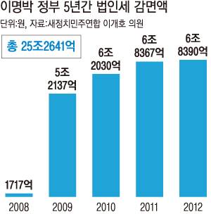 이명박 정부의 법인세 감면 조치로 매년 7조원에 육박하는 법인세가 감면되고 있는 것으로 나타났다. 올해 세수부족 예상액이 5조6000억원으로 법인세 감면이 없었다면 세입추경(세수가 부족해 국채를 발행해 추가 재원을 마련하는 것)을 하지 않아도 됐다는 뜻이다. 이명박 정부 5년간 감면된 법인세는 25조원이 넘었다. 기업에 깎아준 법인세가 국민 부담으로 돌아오고 있다.