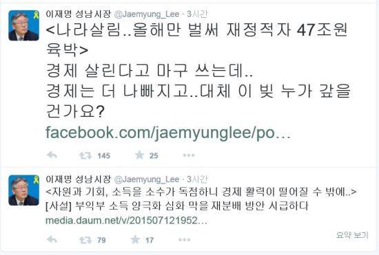 이재명 성남시장은 13일 자신의 페이스북을 통해 ‘나라살림..올해만 벌써 재정적자 47조원 육박’이라는 글을 통해 “경제 살린다고 마구 쓰는데 경제는 더 나빠지고 대체 이 빚은 누가 갚을 건가요?”라고 반문했다.