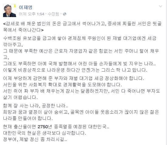 이재명 성남시장은 16일 자신의 페이스북을 통해 “감세로 배 채운 법인의 돈은 금고에서 썩어나가고, 증세에 찌들린 서민은 뒷골목에서 죽어나간다”라고 주장했다.
