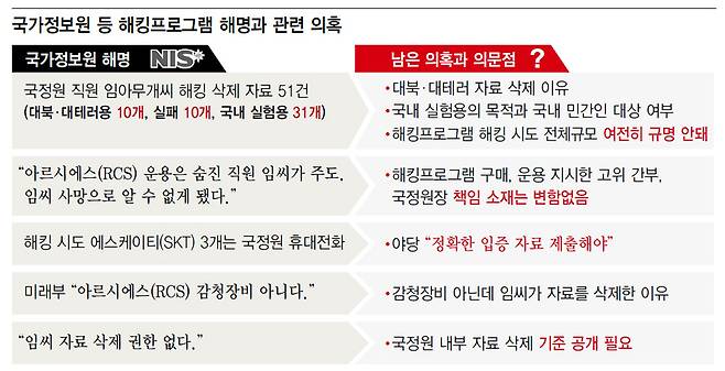 27일 국가정보원의 해킹 의혹 진상규명을 위해 국회 정보위원회가 열렸으나 국정원의 석연치 않은 해명이 의혹을 더욱 증폭시키고 있다. 국정원은 지난 18일 스스로 목숨을 끊은 국정원 직원 임아무개(45)씨가 삭제한 자료를 복구한 결과 "대북·대테러용이 10개, 잘 안된 게(실패) 10개, 나머지 31개는 국내 실험용"이라고 밝혔다. 그러나 임씨가 왜 실험용이라면서 국내를 대상으로 한 31개를 삭제했는지, 실험의 대상은 누구인지에 대해 국정원은 "국내 사찰이 아니다"라는 대답 외에 납득할 만한 해명을 내놓지 못했다.