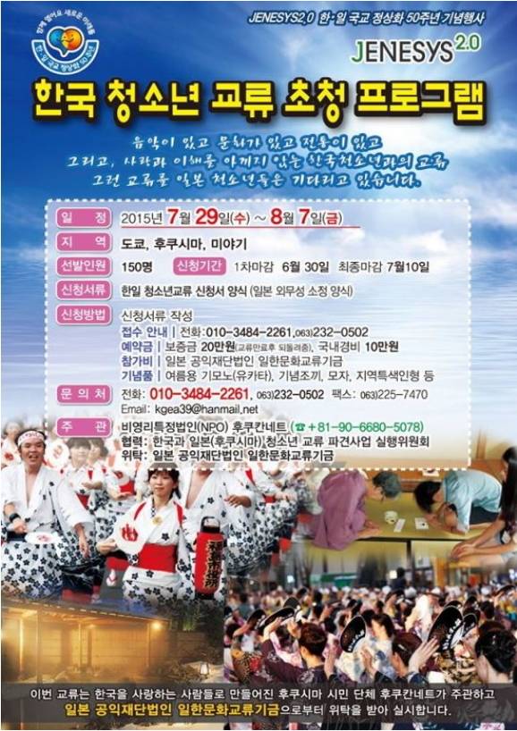 ‘후쿠칸네트’라는 이 단체는 29일부터 다음달 7일까지 일본 외무성의 후원을 받아 국내 청소년 150명, 인솔자 21명 등과 함께 일본 후쿠시마(福島), 도쿄(東京), 닛코(日光) 등을 방문할 예정이다.
