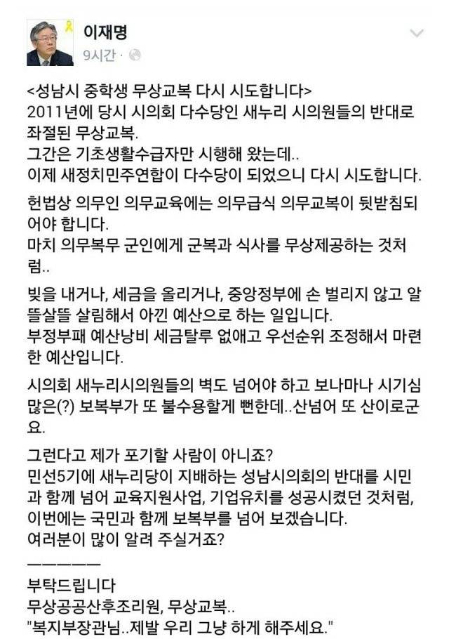 [헤럴드경제=이재문 객원리포터] 성남시가 중학교에 입학하는 신입생들에게 교복 구매비를 지원하는 ‘무상교복’ 시행에 앞서 보건복지부에 협의를 요청한 가운데 이재명 성남시장의 SNS 발언에 시선이 쏠리고 있다.
