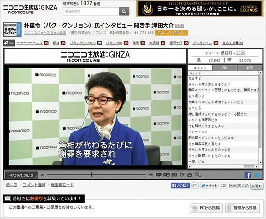 박근혜 대통령의 여동생 근령씨가 7월30일 일본 동영상 사이트 <니코니코>와 한 인터뷰가 8월4일 공개되었다.