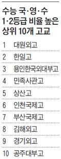 그 결과 작년 수능에서 상위권 학생 비율이 가장 높았던 학교는 서울 대원외고였다. 이어 공주 한일고, 용인한국외대부고, 민족사관고 순으로 상위권 비율이 높았다. 상위 10개 고교 중 일반고로 2개교(한일고, 공주대부고)가 포함됐지만, 이 두 학교는 모두 전국 단위에서 학생을 선발하는 비평준화 학교다. 수능 상위권 고교 50개를 분석한 결과 자사고와 특목고가 42개로, 전년도 (39개교)보다 3개교가 늘어난 것으로 나타났다. 쉬운 수능 체제에서 전반적으로 자사고, 특목고 학생들의 성적이 더 향상된 것이다.