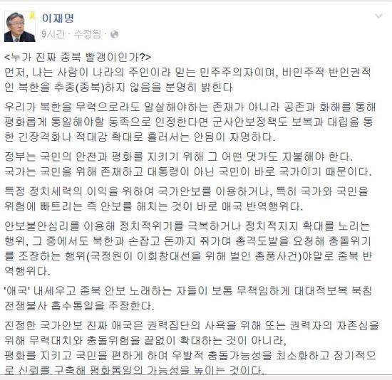 이재명 성남시장은 23일 자신의 페이스북에 ‘누가 진짜 종북 빨갱이인가?’라는 글을 올렸다.