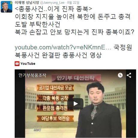 이재명 성남시장은 지난 22일 트위터에 "총풍사건..이게 진짜 종북"이라며 "이회창 지지율 높이려 북한에 돈 주고 총격 도발 부탁한 사건. 북과 손잡고 안보 망치는 게 진짜 종북이죠?"라는 글을 올렸다. 당시 사건을 보도한 방송 뉴스 영상도 함께 게재했다.