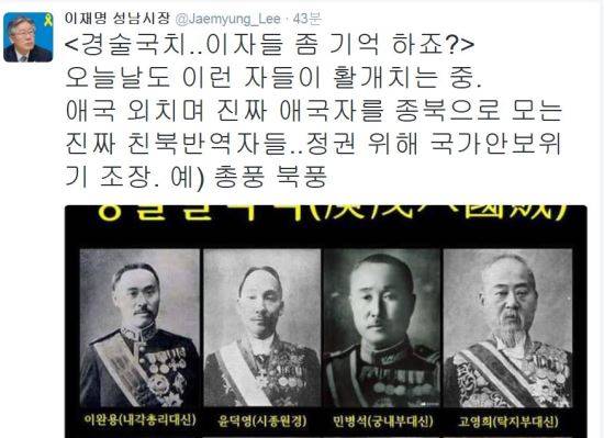 이재명 성남시장은 30일 자신의 트위터를 통해 “경술국치.이자들 좀 기억 하죠?”라고 적었다.