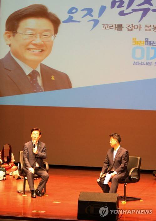 (성남=연합뉴스) 이우성 기자 = 이재명 경기 성남시장이 5일 오후 성남시청 온누리실에서 '카·페·트 친구모임 토크 콘서트'를 열고 있다.