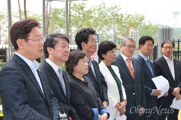 보건복지부에 대한 국정감사가 진행 중인 10일 새정치연합 김성주·김용익·남인순·안철수·양승조·이목희·인재근·최동익 의원은 이재명 성남시장과 함께 정부세종청사 보건복지부 현관 앞에서 기자회견을 열었다.