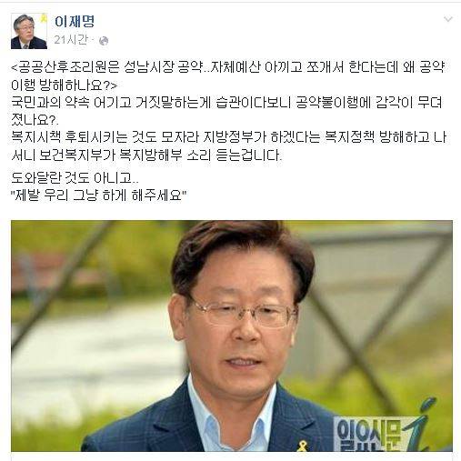 이재명 성남시장은 11일 자신의 페이스북을 통해 “공공산후조리원은 성남시장 공약”이라며 “자체 예산 아끼고 쪼개서 한다는데 왜 공약이행 방해하나요?”라고 되물었다.