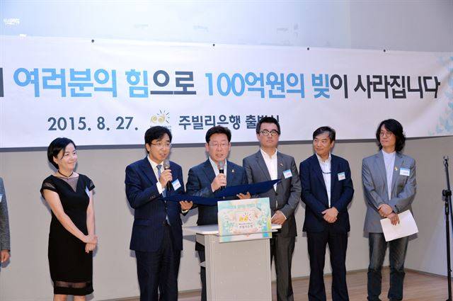 '사람을 살리는 착한 은행' 주빌리은행 출범식에서 공동은행장인 이재명(왼쪽에서 세번째) 성남시장과 유종일(두번째)KDI국제정책대학원 교수가 출범선언문을 낭독하고 있다. 성남시 제공