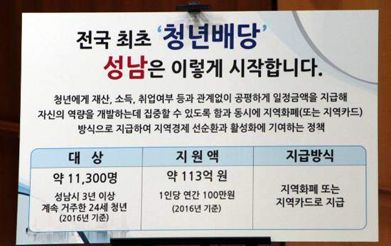 "현재 거의 모든 지방자치단체의 재정자립도가 떨어지고 있는 상황이라 복지 정책을 하나 만들어 추진하는 것도 쉽지 않다. 성남시는 그나마 재정자립도가 좀 나은 편이고, 재정위기를 겪으면서 성남시 나름대로 구조조정이 된 상태라 청년배당 정책을 추진하는 데는 별 무리가 없다.