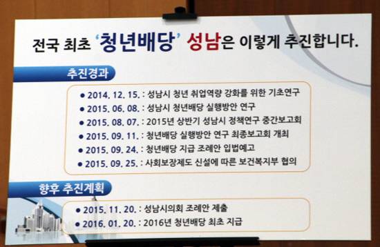 | ▲ 이재명 성남시장 "박근헤 정부, 청년배당 받아들여야" 성남시의 청년배당 정책을 설명하는 판넬 |