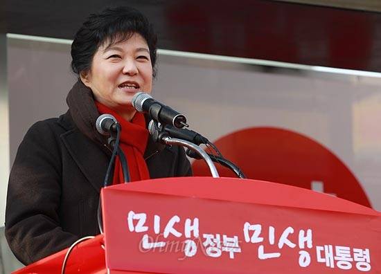 | ▲ 2012년 12월 17일 당시 박근혜 새누리당 대통령 후보가 경기도 수원 팔당구 지동시장 유세에서 유권자와 지지자들에게 대선승리를 다짐하며 지지를 호소하고 있다. |